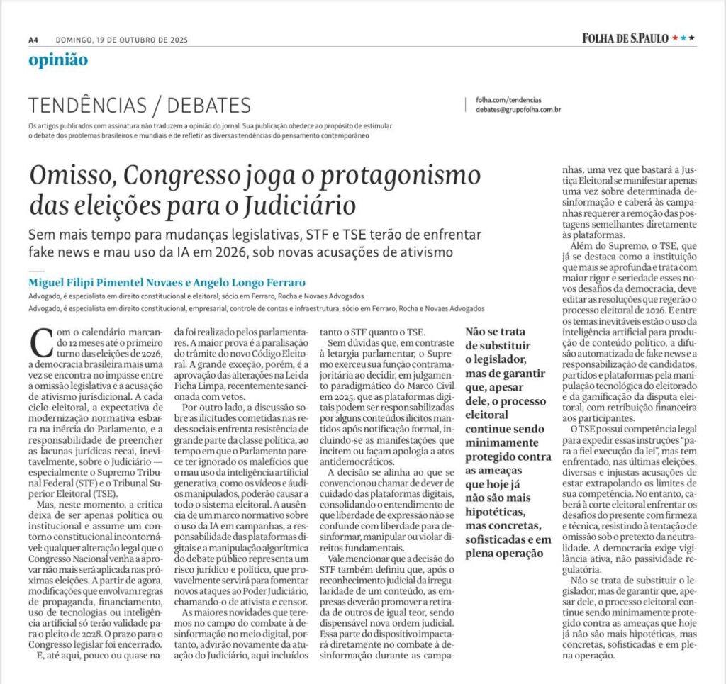 Em artigo de opinião publicado na Folha de S.Paulo (edição impressa de 19 de outubro de 2025), os advogados Angelo Ferraro e Miguel Novaes, sócios do Ferraro, Rocha e Novaes Advogados, analisam os impactos jurídicos e institucionais dessa omissão legislativa e o consequente deslocamento de responsabilidade para o Judiciário.